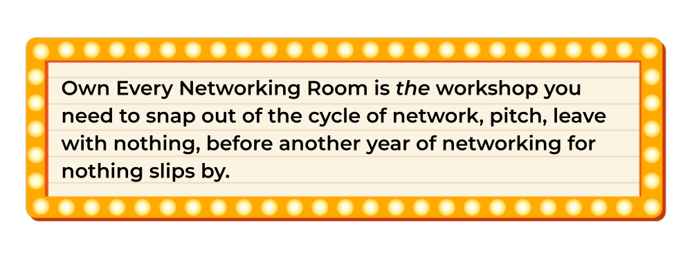Own Every Networking Room is the workshop you need to snap out of the cycle of network, pitch, leave with nothing, before another year of networking for nothing slips by.