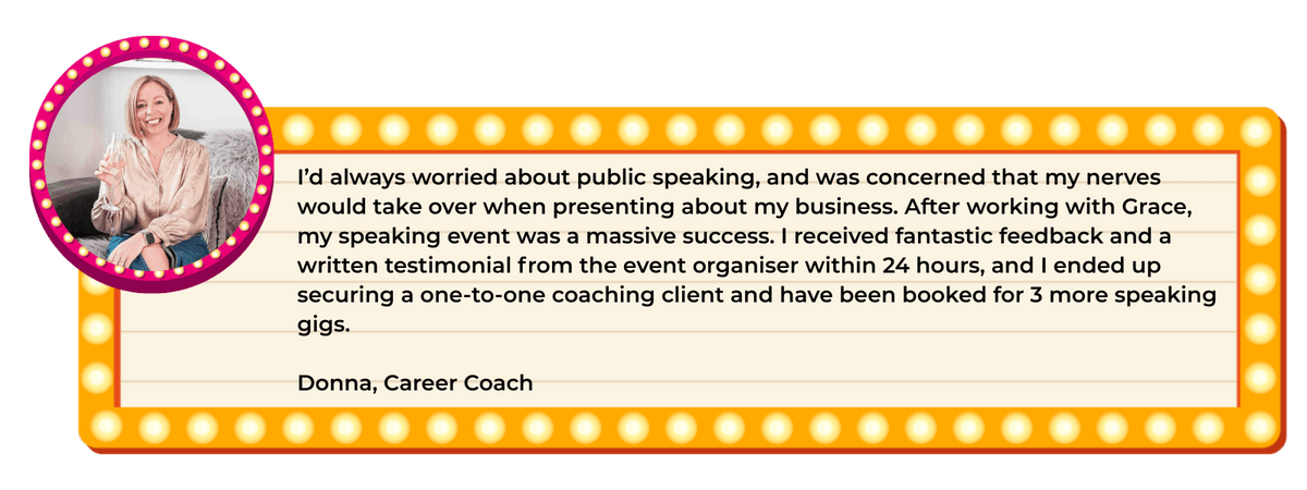 I’d always worried about public speaking, and was concerned that my nerves would take over when presenting about my business. After working with Grace, my speaking event was a massive success. I received fantastic feedback and a written testimonial from the event organiser within 24 hours, and I ended up securing a one-to-one coaching client and have been booked for 3 more speaking gigs.