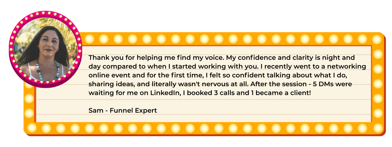 Thank you for helping me find my voice. My confidence and clarity is night and day compared to when I started working with you. I recently went to a networking online event and for the first time, I felt so confident talking about what I do, sharing ideas, and literally wasn't nervous at all. After the session - 5 DMs were waiting for me on LinkedIn, I booked 3 calls and 1 became a client!